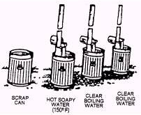 Figure 10-57.-Immersion heaters for mess kit washing setup. In the field you must care for your own mess kit. Proper washing is important; otherwise, food particles remain and become breeding places for disease germs. The galley maintenance personnel usually set up four corrugated cans or other similar containers, placed in a row, for washing your mess kit. The first can is used to scrape the food particles from your mess kit into. The second contains hot water with soap or detergent, and the third and fourth cans contain clear water which is kept boiling throughout the washing period (fig. 10-57). Along-handled brush is furnished so you can wash your mess kit. To clean your mess kit properly, follow the steps given below: 1. Scrape the food particles from your mess kit into the scrap can. 2. Wash your mess kit in the first container of hot soapy water, using the long-handled brush. 3. Rinse your mess kit in the second can of boiling water by dipping it up and down several times. 4. Disinfect your mess kit by immersing it in the third container of boiling water for several seconds. 5. Shake your mess kit to remove excess water and allow it to dry in the air; then close it to keep out dust and vermin. If your mess kit becomes soiled or contaminated between meals, it should be washed again before use. When desirable to preheat utensils before a meal, a corrugated can with clear boiling water is placed near the start of the serving line. It is important that such water be maintained at a rolling boil throughout the meal service period. |