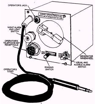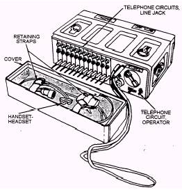 Figure 11-18.-TA-221/PT operator's pack. The TA-1/PT can be used with the SB-22/PT telephone switchboard. To place an outgoing call with the TA-1/PT, first press the generator lever. Then, listen for the distant party to answer. When you are ready to talk press the talk switch. When listening, release the Dress-to-talk switch. The buzzer sounds for an incoming