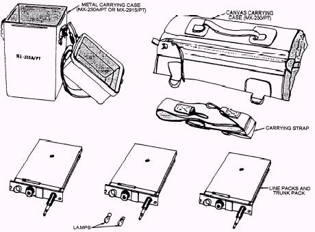 Figure 11-20.-Accessory kits, MX-230/PT, MX-230A/PT, and MX-2915/PT. Figure 11-21.-Handset-headset, H81A/U. Figure 11-22.-Operator's pack control and function. and their functions. Figure 11-22 lists the controls and their functions in operating the OPERATOR'S PACK; figure 11-23 lists the controls and their functions in operating the LINE and TRUCK PACKS. To put the SB-22/PT switchboard into operation, you first put on your HANDSET-HEADSET and