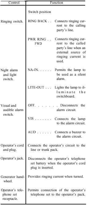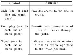 Figure 11-23.-Line and trunk packs control and function. connect it to the switchboard in the following manner: 1. Place the headset (fig. 11-21) over your head so the receiver covers one ear. 2. Position the transmitter directly in front of your mouth. 3. Align the connector (fig. 11-21) on your headset cord with the receptacle on the operator's pack (fig. 11-18). Push it into the connector and turn it to the right so it locks in place. NOTE: The spacing of the lugs around the inside of the connector determines the position of the connector. 4. Clip the PUSH-TO-TALK SWITCH on the handset-headset to the front of your shirt. After inserting the plug of your operating cord into the operator's pack (fig. 11-18), place the push-to-talk switch into any of the positions shown in figure 11-24. When answering the calling party, watch the signals on the front of the line packs (fig. 11-19); the line signals turn from black to white. Follow the procedures below to answer the incoming call (fig. 11-25, view A). 1. Remove the plug of the operator's cord from the operator's jack and insert it into the jack that shows the white line signal (calling party's line signal). 2. Obtain the called party's name or number from the calling party and then proceed to interconnect the parties. When connecting the calling party to the called party (fig. 11-25, view B), pull out the cord in the calling party's line and insert the plug into the called party's line
