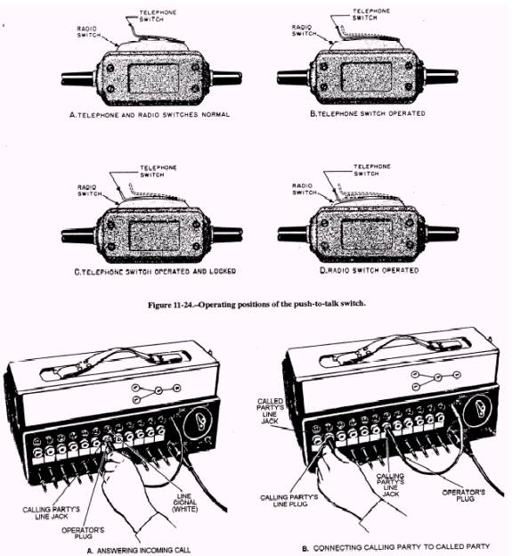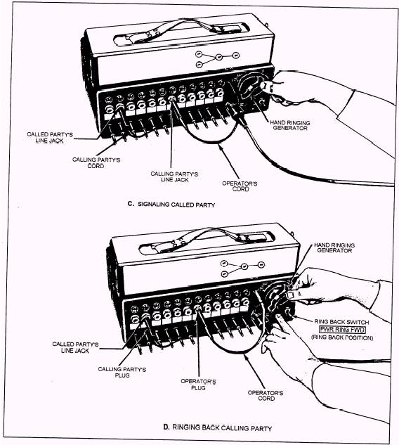 switchboard. Figure 11-25 C and D.-Steps required to connect local calls through the SB-22/PT switchboard. jack (fig. 11-25, view C). Then, signal the called party by turning the hand-ringing generator (fig. 11-18) rapidly for approximately 10 turns. Do NOT operate the RING BACK-PWR RING FWD switch to either position. Wait for the called party to answer. After the called party answers, remove the operator's plug from the called party's jack and insert it into the operator's jack. After the calling and called parties finish talking, both parties should ring off. The ring-off signal causes the calling party's line to turn white. If you should have to challenge the ring-off signal, remove the operator's plug from the operator's jack and insert it into the calling party's jack Ask the parties if they have finished. If no one answers, disconnect the circuit. Remove the operator's plug from the calling party's jack and insert it into the operator's jack. If the calling party disconnects before the called party answers or before the conversation is completed, Figure 11-26.-Installation arrangement for two switchboards. you can ring back the calling party (fig. 11-25, view D). You do this by removing the plug of the operator's cord from the operator's jack on the operator's pack and inserting it into the calling party's jack. Operate the RING BACK-PWR RING FWD switch to the RING BACK, turn the hand-ringing generator rapidly approximately 10 turns. Remove the operator's plug from the calling party's jack and insert it into the operator's jack when both parties answer. If the called party disconnects before the conversation is completed, remove the plug of the operator's cord from the operator's pack and insert it into the jack of the calling party's line jack Operate the hand-ringing generator rapidly about 10 turns. Remove the plug of the operator's cord from the jack of the calling party's line jack and insert it into the operator's jack on the operator's pack after both parties have answered. If you must leave the switchboard, move the visual and audible alarm switch (fig. 11-1 8) from VIS to AUD. The alarm is silent on VIS, but audible on AUD. When the alarm is not required, place the VIS/AUD switch in the OFF position. To operate your switchboard in the dark, pull out on the lamp cap and turn the lamp on. Remember, though, when the lamp is lighting the switchboard, the night alarm cannot be used at the same time. |
