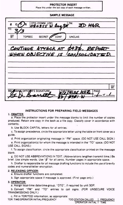 FIELD MESSAGE FORMAT AND PREPARATION The field message book, NAVMC 694, is primarily and extensively used in a tactical environment. Each book contains a hundred message forms that are self-carboning for easy duplication. A sample message and instructions for preparing field messages are depicted in figure 11-27. Spaces are provided at the bottom of the form to record the time of receipt (TOR) and time of delivery (TOD). The form is also a convenient reference when records are necessary. TACTICAL MESSAGE FORMATS The different types of reports and their content are published in the battalion's operations order (OPORD). On a patrol or in an emergency, you cannot always readily refer to the OPORD. Providing inadequate information, or even worse no information, about tactical situations can be harmful and can prevent a proper response. Always depict who, what, when, where, and how, if known; then, follow it up later as more information becomes available. The rule of thumb for reporting tactical information is to remember the following acronym SALUTE. Size of enemy unit Activity of enemy unit Location of enemy unit(s) Uniform worn by the enemy Time of each activity noted Equipment used or carried by the enemy SECURITY An important rule of communication is to remember that the enemy is always listening; therefore, we must always use correct security procedures when communicating classified information. Even seemingly unimportant unclassified information can be a valuable source of intelligence to the enemy. So certain information is prohibited from being transmitted in the clear. This type of information is known as Essential Elements of Friendly Information (EEFI). The EEFI system is actually a code that allows us to notify one another of a security breach that has occurred over a circuit. The term used to identify a violation of this type is BEADWINDOW (example: BEADWINDOW THREE). This indicates to the
