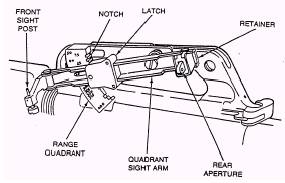3-3.-Quadrant sight assembly. from 50 to 250 meters in 50-meter increments. The windage adjustment screw moves the blade element horizontally to provide windage adjustment capabilities. The elevation adjustment machine screw, when loosened, allows the blade element to be moved vertically, providing elevation adjustment capabilities. The M203 also has a quadrant sight assembly (fig. 13-3) that connects to the carrying handle of the M16 rifle. It consists of a sight arm, a range selection quadrant, an aperture, and post for sighting operation of the launcher. The range selection quadrant has embossed range graduations from 50 to 400 in 25-meter increments. The 25-meter increments also allow for better accuracy at a greater number of range variations than the quadrant sight (fig. 13-4). For elevation adjustment, turn the front sight post to the right to decrease elevation and to the left to increase elevation. NOTE On elevation, one notch equals 5 meters at 200 meters. For windage adjustment, press the rear sight retainer and move the aperture away from the barrel to move the trajectory of the projectile to the left. Move the aperture toward the barrel to move the trajectory to the right. NOTE On windage adjustment, one notch equals 1.5 meters at 200 meters. BARREL