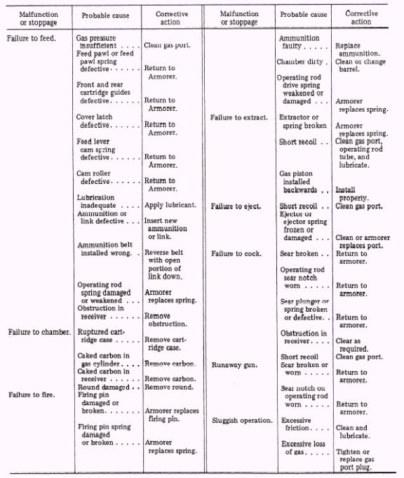 ACTION Immediate action is the action taken to reduce the stoppage without investigating the cause. This action must be accomplished within 10 seconds, including waiting time, when the barrel is hot enough to cause a cook off. A cook off is the ignition of a round caused by the heat of the chamber without the firing pin striking the primer of the cartridge. One hundred and fifty rounds fired in a 2-minute period may heat the barrel sufficiently to cause a cook off. If a stoppage occurs, wait 5 seconds. (The bolt must remain forward for the first 5 seconds because of the possibility of a hangfire.) After the 5-second wait, raise the cover and remove the ammunition belt and the links from the feed tray. Pull the cocking handle to the rear, making sure the sear engages the sear notch in the operating rod; close the cover immediately; then return the cocking handle to its forward position. During the retraction of the bolt, observe the round being extracted and ejected. If the round is NOT extracted, pull the trigger, attempting to fire the round. If the round does not fire and the barrel is hot, wait at least 5 minutes with the bolt in the forward position to prevent damage or injury to personnel in the event of a cook off. After the 5-minute wait, remove the round by using a cleaning rod inserted from the muzzle end of the gun. When the round is extracted or when a round is removed from the chamber, inspect the gun and ammunition to determine the cause of the stoppage. After cleaning the machine gun, reload, rezero in on the target, and attempt to fire. Table 13-1.-Malfunctions or Stoppages, Their Causes, and