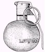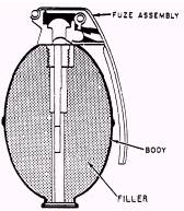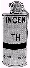 12-4.-Incendiary hand grenade. The radius of the burst is approximately 6 meters, but fragments of the plastic body occasionally fly as far as 27 meters. Effective portions of the agent may be carried as far as 75 to 100 meters downwind. Personnel using these grenades should wear protective gas masks. Incendiary