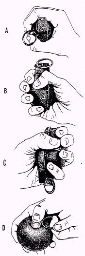 12-9.-Methods of holding the grenade. grenade throwing and to overcome any fear that you may have of handling explosives. Consider safety first when you are determining the proper method of holding the grenade. For maximum safety and throwing comfort, cradle the grenade in your throwing hand with the safety lever held in place by that part of your thumb between the first and second joints (fig. 12-9, view A). For right-handed personnel, hold the grenade upright (fig. 12-9, view B). This positions the pull ring so you can remove it easily with the index finger of your free hand. For left-handed personnel, invert the grenade (fig. 12-9, view C) in your hand with the fingers and thumb of the throwing hand in the same position as right-handed personnel.