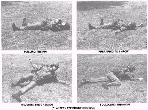 Figure 12-11.-Throwing positions-Continued. military training exercises, your position during a combat situation is dictated by the amount of available cover and the location of the target. The positions given below point out the use and limitations of each position. The STANDING POSITION (fig. 12-11, view A) is the most natural one from which to throw grenades. This position allows you to obtain the greatest possible throwing distance. To throw from this position, use the instructions listed above and shown in figure 12-10. The KNEELING POSITION (fig. 12-11, view B) reduces the distance that you can throw a grenade. Use this position when you have only a low wall, a shallow ditch, or a similar type of cover to protect you. To throw from this position, use the following instructions: 1. Using the proper grip and holding the grenade shoulder high, kneel in the most comfortable manner. 2. Throw the grenade with a natural throwing motion. Push off with your trailing foot to put more force in the throw. 3. As you release the grenade, drop to the prone position or behind available cover to reduce your exposure to fragmentation. Use the PRONE-TO-KNEELING POSITION (fig. 12-11, view C) when no cover is available and the grenade must be thrown a greater distance than is possible from the prone position. To throw from this position, use the following instructions: 1. Face the target and assume the prone position. Hold the grenade forward of your head where you can observe the grenade as you remove the safety pin. 2. After the safety pin is removed, quickly assume the kneeling position. 3. After throwing the grenade, quickly return to the prone position with your helmet facing in the direction of the target. The ALTERNATE PRONE POSITION (fig. 12- 11, view D) reduces both throwing distance and accuracy. This position should be used when you are pinned down by hostile fire and are unable to rise and engage your target. To throw from this position, use the following instructions: 1. Lie on your back with your body perpendicular to the intended line of flight of the grenade. Hold the grenade at shoulder level as in the standing position 2. Your right leg (left leg for left-handed throwers) should be cocked with your foot braced firmly against the ground. After removal of the safety pin, hold the grenade away from your body with your arm cocked for throwing. 3. With your free hand, grasp any object that is capable of giving you added leverage. This leverage will increase your throwing distance. In throwing the grenade, push off with your rearward foot to give added power to your throw. After throwing the grenade, roll over onto your stomach and press yourself flat against the ground. |