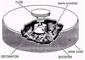 12-12.-Typical pressure type of land mine mechanism. Under no circumstances should you attach grenades to clothing or equipment by the PULL RING. Attaching grenades to clothing or equipment by the pull ring can easily result in the safety pin being accidentally removed from the grenade. When handling a noncasually-producing hand grenade, such as the chemical type, you should not be closer than 10 meters to the grenade while it burns. You should not look directly into the thermite mixture since it may cause temporary blindness or even permanent eye damage. The safety lever of a chemical hand grenade, other than the ABC-M25A2, should not be released before the grenade is thrown because of its extremely short time-delay period. Riot control hand grenades should not be thrown into a closed area nor should they be detonated within 5 meters of personnel. Smoke hand grenades should not be used in a closed area. At least a 30-minute waiting period should elapse before you approach a chemical grenade dud, and then only authorized ordnance-disposal personnel should approach it. |