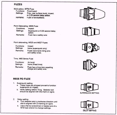 FUZES The fuzes used on mortar rounds are designed to activate the fired round at the desired time or place (fig. 14-11). There are three types of fuzes used with the 60-mm mortar ammunition: impact, graduated time, and variable time. The IMPACT FUZE causes the round to function when it comes in contact with an object. Impact fuzes can be either point detonating (PD) or base detonating. Point-detonating fuzes that function immediately upon impact are called superquick (SQ). Point-detonating fuzes that have some penetration into the ground before functioning are called quick (Q). Point-detonating fuzes that enter the ground before functioning are known as delay (D). The GRADUATED TIME FUZES cause the round to function at a prescribed (set) time after the round is fired. Graduated time fuzes may function at the prescribed time only. These fuzes are known as time (T) fuzes. Graduated time fuzes may also have an impact element that causes the fuze to function on impact if it does not function at the set time. These fuzes are known as TIME AND SUPERQUICK (TSQ) FUZES. The VARIABLE TIME FUZES have their own radio transmitter and receiver. They transmit a radio signal. This signal is reflected back to the fuze. As the fuze (round) approaches an object, the strength of the