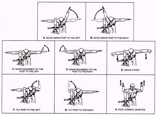 Figure 14-14.-Arm-and-hand signals used in placing out aiming post. rechecks to see that all level vials are centered. When the center of the barrel and the sight of the compass are in line and all bubbles level, the gun is laid. The section leader then directs the gunner to refer the sight and put out their aiming posts. "Refernng the sight" means making a deflection change on the sight without moving the mortar. To refer the sight, you turn the deflection knob until the given deflection is set on the sight. When using the M64/M64A1 sight, you can place the aiming posts where they can best be observed because the deflection scale can be slipped to read the desired deflection. The sight (M64/M64Al) is initially referred to a O-nil reading, and the aiming posts are set on that deflection. |