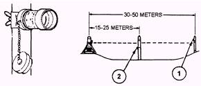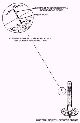 PLACING AIMING POSTS Normally two aiming posts are placed out to establish the aiming line. The rounds are fired from the mortar in reference to this line. After the mortar has been mounted and laid on the direction stake, the sight is normally refereed to 2,800 mils, and the aiming posts are placed along this line of sight. The aiming posts are placed on the new line of sight by the first ammunition bearer, observing the arm-and-hand signals (fig. 14-14) of the gunner. The posts are called the far post and the near post. The far post is placed out 30 to 50 meters from the mortar, and the near post is placed at 15 to 30 meters (fig. 14-15). When this is not possible, because of terrain or situation, the post should be placed out as far as possible, keeping in mind that the distance between the two posts must be equal. The far post is always placed first and the near post last. When these two posts are seen through the sight, they appear as one. This is called