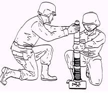 LOADING AND FIRING In the drop-fire method (conventional mode), as soon as the gunner ensures that the mortar is laid correctly, he removes the sight unit and sets the selector to the D (drop) position. This is done only for the first three rounds or until the baseplate is settled, at which time the sight may stay on the mortar while firing. The gunner kneels on the left side of the cannon and looks into the sight unit. The assistant gunner kneels on the right side in front of the traversing mechanism, facing rearward. The ammunition handler kneels beside the assistant gunner slightly to the rear (fig. 14-18). The ammunition handler adjusts the propellant charge for the desired range, sets the fuze for the desired