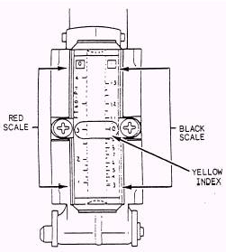 Figure 14-20.-Range indication. The range indicator (fig. 14-20) consists of a vial that contains a ball that moves when the cannon is elevated or depressed to indicate the firing range. The black scale is for charge one; the red scale is for charge zero. The yellow index (range 3 on the red scale and range 10 on the black scale) is a warning reminder to brace the baseplate before firing. The ammunition handler prepares the cartridge. As the gunner sets the firing selector in the T (trigger) position, the assistant gunner inserts the round into the muzzle, releases the round, and assumes a safe position. The gunner lays-in the weapon by using the range indicator and sighting over or on the side of the muzzle for the azimuth. Holding the mortar steady, the gunner assumes a safe firing position. When the weapon is on target, the gunner squeezes the trigger to fire, then releases the trigger in preparation for the next round. |