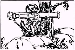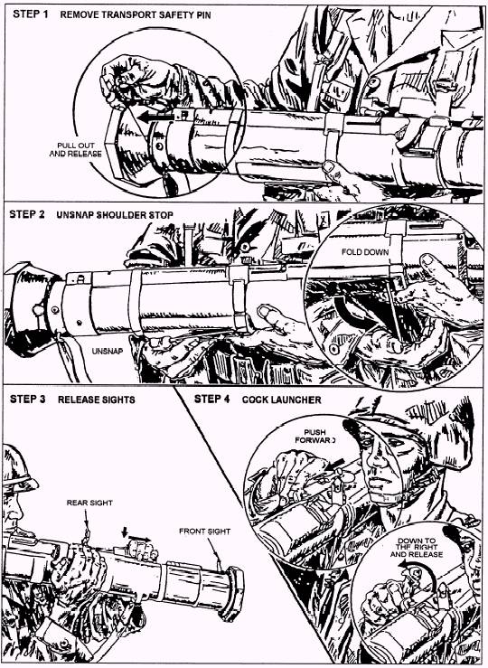 WARNING KEEP WEAPON POINTED TOWARD TARGET. CHECK BACKBLAST AREA. l Cock the launcher (Step 4, fig. 14-31) by unfolding the cocking lever with your right hand. Place your thumb under the cocking lever and, with the support of your fingers in front of the firing mechanism, push the cocking lever forward and then downward to the right. Let the cocking lever slide back CAUTION DO NOT REFOLD THE COCKING LEVER. THIS WILL INTERFERE WITH THE FUNCTION OF
