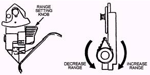 Figure 14-33.-Adjust range setting. . Press the shoulder stop against your shoulder (fig. 14-32). For added stability, grasp the carrying sling near the muzzle with your left hand and pull back on the carrying sling until the shoulder stop is snug against your shoulder. l Adjust the rear sight (fig. 14-33). When uncovered, the rear sight is preset on 200 meters, which is the battle-sight setting. During target engagement for targets more than 200 meters, a sight adjustment is necessary; for targets less than 200 meters, no adjustment is necessary. The sight is adjustable below 200 meters; however, because of the flight dynamics of the projectile, adjusting the range setting does not increase the hit probability for targets less than 200 meters. l Using the index and middle fingers of your right hand, press the forward safety all the way to the left and hold it. At the same time, pull the launcher into your shoulder with your left hand, keeping your right hand against the forward edge of the firing mechanism housing for firing stability. l To fire the launcher, press the red trigger button by gently applying pressure straightforward with the tip of your right thumb in a steady, smooth movement. When the launcher is prepared for firing but is not fired, it is taken out of operation as follows: . Release the forward safety. . Return the cocking lever to the SAFE, uncocked position by reversing the procedures for cocking, and then fold the cocking lever down. . Remove the launcher from your shoulder. Keep it pointed toward the target. . Reinsert the transport safety pin all the way into the pinhole. l Return the rear sight to the battle-sight setting of 200 meters; fold down the front and rear sight; close the sight covers. CAUTION REAR SIGHT MAY BE DAMAGED IF IT IS NOT RETURNED TO THE BATTLE-SIGHT SETTING
