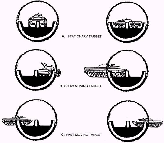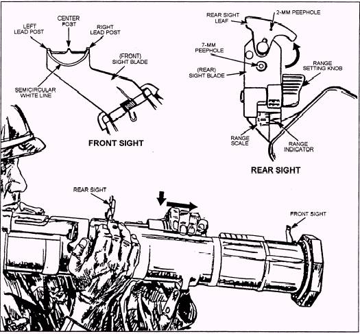 Figure 14-35.-Sight system. l the transport safety pin is in place and fully inserted. The lanyard is attached. . the cocking lever is in the SAFE position and folded down. . the fire-through muzzle cover is intact. If the seal is ruptured or torn, cut the seal out to ensure there are no foreign objects inside the launcher tube. To remove foreign objects, turn the tube muzzle down and shake it gently. Before firing, ensure there are no foreign objects in the muzzle. l the launcher being used has a black color-code band with a yellow band inside. l the sights function properly. Open the covers to see if the sights pop up and are not damaged. . the forward safety does not move when depressed. . the rear seal is not cracked or damaged. The rear seal is inside the venturi and is made of brown plexiglass. Before firing, ensure there are no foreign objects obstructing the rear of the launcher. . the shoulder stop is not broken or damaged, and it unsnaps and folds down. l the carrying sling is not frayed and is attached firmly to the launch tube. l the launcher body has no cracks, dents, or bulges. l the red trigger button is not missing, broken, or damaged. Figure 14-36.-Correct placement of the front sight lead posts. SIGHTS l Front Sight. The front sight consists of a sight blade with a center post and left and right lead posts (fig. 14-35). It has a semicircular white line to aid in obtaining the proper sight picture. To open the front sight cover, press down on the sight cover and slide it rearward. l Rear Sight. The rear sight consists of a sight blade, range setting knob, range scale, 2-mm peephole (for normal light conditions), and 7-mm peephole (for limited visibility) (fig. 14-35). To open the rear sight cover, press down on the cover and slide it forward. AIMING In general, to aim the launcher, you must first estimate the range to the target. Once the range is determined, the launcher is placed in position on the right shoulder so the right eye is 2 1/2 to 3 inches from the rear sight. The firer is concerned with correctly pointing the AT4 so the cartridge hits the target when he fires. To do this, he must have the rear sight, the front sight posts, and the target (or aiming point) in proper relationship-known as the sight picture. A correct sight picture is obtained when the sights are properly aligned and the aiming point (target) is in correct relationship to the front sight posts. |