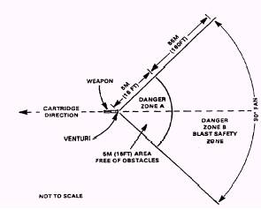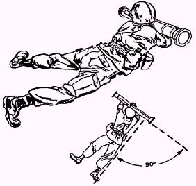 Figure 14-41.-Sitting position. Figure 14-42.-Modified sitting position. Figure 14-43.-Prone position. half-left face. Sit with your legs crossed, and place the launcher on your right shoulder. Place your right hand on the firing mechanism and grasp the carrying sling with your left hand. Lean slightly forward from the hips, and rest your elbows forward of your knees to avoid bone-to-bone contact. 2. To assume the modified sitting position (fig. 14-42), keep the launcher pointed toward the target and execute a half-left face. Sit with your legs partly extended and well apart; place the launcher on your right shoulder. Dig your heels into the ground as in the conventional rifle position. Rest your elbows forward of your knees to avoid bone-to-bone contact. Advantages- Stable firing position. You are a small target. Figure 14-44.-Backblast danger zones. Disadvantages- Restricted movement. Limited visibility. Prone Position To assume the prone position (fig. 14-43), first lay the launcher on the ground, pointed toward the target. Then lie on your stomach at an angle of not less than 90 degrees to the line of fire to keep your body clear of the backblast. Your body should be straight, and your right leg should be directly on a line running through your right hip and right shoulder. Move your left leg to the left as far as possible without discomfort. Keep both heels close to the ground. Place the launcher on your right shoulder and place both elbows under the launcher. Hold your head steady with your right eye lined up with the sights. Tracking a moving target from the prone position is not recommended. The firer's movement is limited. Your legs and feet could be injured by the backblast by changing the position of the launcher. Advantages- Very stable firing position. You are a small target. Disadvantages- Limited movement for tracking. Limited elevation of the launcher. Poor visibility. |