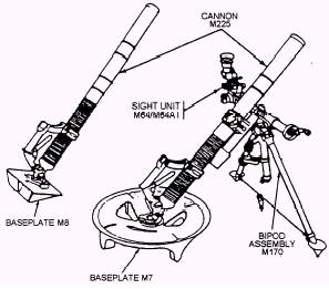 MORTAR AND AT4 The mortar is perhaps the oldest type of firearm known to mankind, and its existence dates back as early as the fourteenth century. At that time, it was nothing more than a shallow steel pot filled with gunpowder and rocks that was aimed in the general direction of the target and fired by touching the powder with a red-hot iron rod. As you can guess, it was very inaccurate; however, it did possess one extremely important characteristic that is just as important today as it was then. This characteristic is the high angle of fire that enables it to be fired over obstacles, such as hills, forests, walls, or other defenses. As you can see, this is very important. The weapon can reach and destroy targets beyond the capabilities of flat trajectory weapons, such as a rifle, but the crew firing it is also protected from enemy observation and fire by these same obstacles. The modern mortar is an extremely accurate and effective weapon that has an adjustable biped and telescopic sight (fig. 14- 1). The modern mortar has a