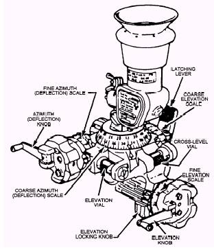 Figure 14-5.-Sight unit (M64/M64A1). telescope mount and a nonmaintainable elbow telescope, fastened into one unit for operation. The elbow telescope provides magnification and a line of sight from which the mortar is aimed. The elbow telescope is a 1.5-power, fixed-focus telescope. The cross lines are at right angles to each other. The TELESCOPE MOUNT consists of the lower, center, and upper parts. The lower part contains a locking lever latch, an elevation micrometer knob with scale, and an elevation locking knob. There is also a dovetail bracket located on the right side of the mount that mates with the dovetail slot located on the yoke of the biped. A semicircular, coarse elevation scale indicates from 700 to 1,600 mils in 100-mil increments. The ELEVATION KNOB contains an elevation micrometer scale of 100 mils, numbered in l-mil increments from 0 to 100. Turning the elevation knob tilts the mount in elevation to the desired angle, as read on the coarse and micrometer elevation scales. The elevation locking knob prevents the elevation knob from rotating during firing. The center part of the telescope mount has a deflection knob that rotates the mount for direction. A crank is provided on the knob for rapid deflection movement. The deflection locking knob locks the