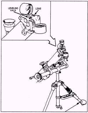 Figure 14-6.-Boresight (M115). deflection knob during firing. The coarse deflection scale is fixed to the upper parts of the center section and has 64 graduations. This scale rotates with the upper part of the telescope mount. The coarse deflection slip scale is located adjacent to the coarse deflection scale. The micrometer deflection slip scale has 100 black graduations, numbered from 0 to 100 in increments of 1 mil. The M225 cannon, the M8 baseplate, and a heat protective mitten are all that is required to use this weapon in the hand-held mode. The BORESIGHT (Ml15) (fig. 14-6) is used to calibrate the sight for the mortar. Since no two mortars are exactly alike, each sight MUST be calibrated on its own mortar. The body of the boresight contains three level vials. They are used to determine that the angle of elevation (preset at 800 mils) and to determine that the V-slides are in a perpendicular position. THE AIMING POST (M1A2) is used with the mortar as an aiming point. Two aiming posts are provided for each mortar. These aiming posts can be separated in the center so as to be more compact when