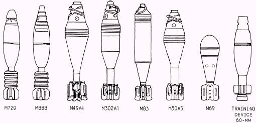 60-MM MORTAR AMMUNITION Ammunition for the 60-mm mortar is issued in the form of "semifixed" complete cartridges (rounds). The term semifixed used in connection with ammunition signifies that the propelling charge is adjustable, and the round is loaded into the weapon as a unit. Except for the M69 training round, all 60-mm mortar rounds have three main assemblies: the fuze assembly, the body assembly, and the fin assembly (fig. 14-7). The M69 training round has no fuze assembly. The body is the main component of the round and contains the material (explosive charge, illuminating charge, or smoke) that produces the desired effect of the round. The fuze assembly controls the method of exploding the shell. The fin assembly stabilizes the round in flight and causes the round to strike with the fuze end first. A propelling charge is attached to or near the fin assembly of the projectile. When fired, the mortar round carries all of its components. Thus the mortar is ready to fire the next round. These rounds are shown in figure 14-8. The principal types of ammunition used in a mortar round are discussed in the topics that follow.