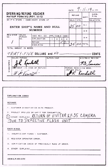 CASH REGISTER MALFUNCTIONS . Keep a cash sales log and record the total dollar value of each sale. Use an adding machine to total the value of merchandise bought by each customer. The log will include columns for item sold, quantity of the item sold, unit selling price, and extended selling price. REFUNDS . When merchandise is guaranteed by the manufacturer and returned within the warranty period All refunds must be approved by the ship's store officer before the retail store operator can accept an item and give the customer a cash refund. Process the refund on an Overring/ Refund Voucher, NAVSUP Form 972 (fig. 2-6). The voucher will include a short description of material returned and will be signed by the ship's store officer, the retail store operator, and the customer. Once the store operator receives the signed refund voucher from the customer, a refund can be paid out of the cash in the register. The store operator will then place the overring/ refund voucher under the cash tray until daily collections. The voucher will then be collected by the ship's store officer or cash collection agent. The amount of refund will be reported as a separate entry in the Cash Register Record, NAVSUP Form 469, and the Cash Receipt Book, NAVSUP Form 470. The voucher itself will be attached to the applicable page of the NAVSUP Form 469. OVERRINGS AND UNDERRINGS . the amount rung up on the register is greater than the price of the item, or Once operator an overring occurs, the sales outlet must prepare an Overring/ Refund