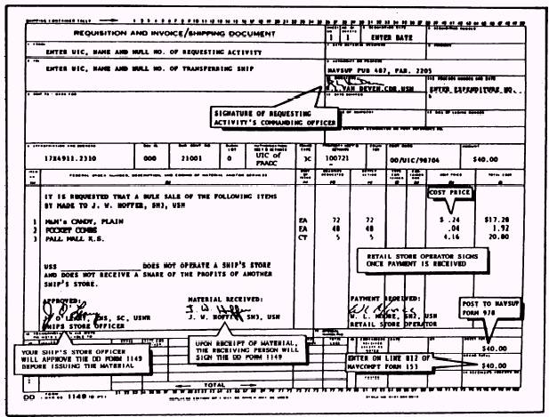 SPECIAL-TYPE SALES In addition to regular sales transactions, you have special transactions that are authorized for ship's store with which you should be familiar. These include group sales, bulk sales, and the sale of traveler's checks. Group Sales The necessity for conducting group sales of ship's store stock is generally limited to ships such as transport vessels or activities that carry or serve individual units of personnel such as Army troops, Marine Corps troops, and large detachments of Navy and Coast Guard personnel. Because ship's store spaces and store hours are generally limited, it is often impossible to serve all the crew plus troop personnel on an individual basis. As a remedy, group sales may be conducted. Under this system, troop units are divided according to squads, platoons, companies, berthing assignments, or some other category, and individual orders for purchases within a group are combined and turned over to one responsible person. This person may then either purchase the group orders directly from the ship's store during hours when it is normally not open for sales, or may clear the orders through the troop quartermaster for further combining. In either case, a considerable amount of time will be required for the ship's store operator to make up and check the group orders, and adequate allowance must be made for this time. For example, when orders are submitted late one afternoon, this person will usually have until the middle of the following morning to make up the orders and check them. Group sales are always made at established retail prices and are cleared through the cash register in the usual manner. Bulk Sales Bulk sales normally are made to Navy exchanges, MSC exchanges, or ships not operating ship's stores when the transferring ship does not provide a composite recreation fund. In other words, the requesting ship does not receive a share of the profits from another ship's store. Bulk sales are made using the Requisition and Invoice/ Shipping Document, DD Form 1149. Requests for bulk sales from activities that are authorized to buy ship's store stock at cost price are submitted by the activities' commanding officer. (See fig. 2-8.) Once you receive this requisition, your ship's store officer will approve it by signing the DD Form 1149. You will then sell the items requisitioned at cost price from the retail store. If your retail store stock is insufficient to cover the order, additional quantities should be obtained from the bulk storeroom using the Intra-Store Transfer Data, NAVSUP Form 973. ROM users must verify that the ship's store stock numbers used by the requesting activity are the same as those used by the issuing ships records. The requesting activity's DD Form 1149 is then taken by the ship's store recordskeeper who will enter the bulk sale into the ROM miscellaneous expenditure function and the ROM will automatically assign an expenditure number. After the bulk sale is entered in the ROM, the DD Form 1149 is taken to the retail store, and the operator will then sell the items requisitioned at cost price. Normally, payment for bulk sales is required at the time of delivery and you, as retail store operator, will acknowledge receiving payment by signing the DD Form 1149. The purchaser will then sign the DD Form 1149 to acknowledge receipt of material. If for some reason the store operator does not receive payment, a copy of the DD Form 1149 will be retained in the cash register. The value of the material will be carried as inventory and included on the last page of the Inventory Count Sheet, NAVSUP Form 238, until payment is received. Once payment is received, it will be rung up on the cash register and the DD Form 1149 will be removed. The cash collected from bulk sales will be reported as a separate entry for information purposes in your Cash Receipt Book, NAVSUP Form 470, and the Cash Register Record,