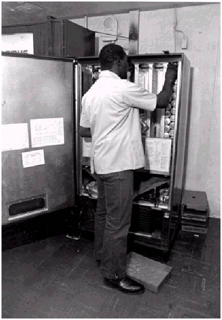 SERVICING THE VENDING MACHINES The operation of the vending machines is sometimes referred to as automatic merchandising. However, the only thing automatic about it is the customer drops a coin into the machine and receives the product in return. Everything else is done by the vending machine operator who services the vending machine. Filling the Vending Machine Filling the vending machine (fig. 2-14) is much easier if the product is stored properly before being dispensed. For instance, during the process of shipping and handling of soda cases, there may be the possibility of damage occurring that goes unnoticed. If these damaged cases are not removed, the cardboard, plastic wrap, and cans in the cases below or adjacent to the damaged cases often remain wet for long periods of time.