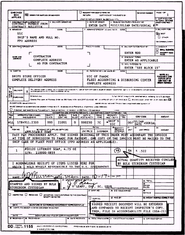 Figure 3-2.- The bulk storeroom custodian accepting receipts. Items that are carried for ultimate expenditure as cost of operation materials and cost of sales items are called cost items. Cost of operation items include items used in the performance of service to customers; for instance, items used in the laundry, barbershop, and repair parts used for the vending machines and snack bars. The internal movement of cost of operation items is referred to as an issue. Cost of sales items require further processing or manufacturing and include snack bar ingre-dients, soft drink syrup, carbon dioxide gas (CO2), straws, spoons, and paper cups. The internal movement of cost of sales items is referred to as a breakout, like retail items. A breakback is just the opposite of a breakout. The breakout is when merchandise is transferred from the bulk storeroom to the sales outlet while a breakback is when merchandise is taken from the sales outlet and returned to the bulk store-room. The internal movement of stock whether breakout, breakback, or issue is documented on an Intra-Store Transfer Data, NAVSUP Form 973. Requests for breakouts are routed by the sales outlet or service activity operators to the ship's store office for processing. After the office prepares a NAVSUP Form 973, there are certain procedures the bulk storeroom custodian should follow. The ship's store office will distribute the original and duplicate copy of the NAVSUP Form 973 to the bulk storeroom custodian to issue the stock. The triplicate copy is retained by the records keeper. The quadruplicate copy is given to the sales outlet or service activity operator receiving the stock. On receipt of the original and duplicate copy of the NAVSUP Form 973, the bulk storeroom custodian will break out the stock. The bulk storeroom custodian must record the quantities broken out on the two documents and sign and forward the original to the office recordskeeper. The duplicate copy is retained by the bulk storeroom custodian. The sales outlet or service activity operator will not have access to the original or the duplicate copy. Once the stock is received in the sales outlet or the service activity, the operator will record the quantities received on the quadruplicate copy of the NAVSUP Form 973. The operator acknowl-edges receipt of the stock by signing the quadruplicate copy and forwards it directly to the recordskeeper. After the recordskeeper receives the original and quadruplicate copy, the quantities received will be circled on the original and entered and circled on the triplicate copy. If a discrepancy is noted between what the bulk storeroom custodian broke out and what the sales outlet or service activity operator received, an inventory will be conducted immediately of the item in the bulk storeroom and the count compared against the corresponding Stock Record, NAVSUP Form 464. After reaching an agreement on the actual quantities broken out, the bulk storeroom custodian and sales outlet operator will correct and initial all copies of the NAVSUP Form 973.