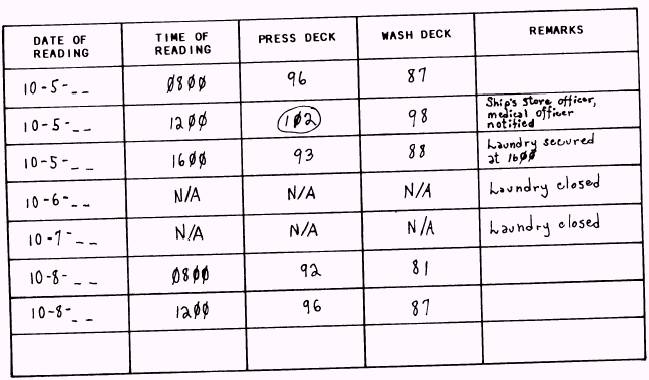 HEAT STRESS Recording temperatures in the heat stress log each 4-hour period Inspecting the laundry for conditions that would cause higher heat Reporting all temperatures 100 or over as required Following the do's and don'ts list included in this chapter The requirements of the Navy's heat stress program are included in OPNAVINST 5100.20, Shipboard Heat Stress Control and Personnel Protection. A hanging dry bulb thermometer should be permanently mounted near the wash and press deck. It should be mounted in such a manner that the bulb of the thermometer is not influenced by adjacent or local heat sources. You should record the temperature readings in the heat stress log using these dry bulb thermometers once every 4 hours. When temperatures are 100 F or more, you should do the following: 1 Log the temperature reading and circle it in the heat stress log. You should remain out of the laundry until further directed on what to do by the medical officer. If the temperature remains high, you will only be able to work certain periods in the laundry. These periods are better known as stay times. These stay times are determined by the medical officer and are always followed by a recovery period where the laundry personnel will go to a cool dry place to allow their body temperature to return to normal. The stay time is always half of the recovery time. The recovery period never exceeds 4 hours provided there is no evidence of cumulative fatigue.