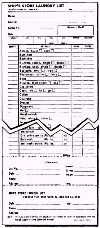 Figure 5-7.- Ship's Store Laundry List, NAVSUP Form 233. In conjunction with the laundry list, laundry net bags should be used for the purpose of keeping rough-dry clothing together during the laundry process. They are open-mesh bags made from cotton or nylon in which the clothes are placed