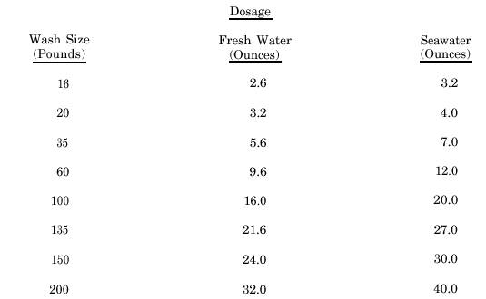 shows the wash sizes and the amounts of two-shot detergent that should be used with fresh water and seawater. The two-shot detergent uses an oxygen-based bleach that is safe in washing all fabrics, therefore, the problem in damaging colored clothes with bleach is eliminated. The bleach is an integral part of the detergent and will not require special handling as it is not reactive to the other ingredients in the formulation. The detergent/ oxygen bleach releases a sharp, unpleasant solvent-type odor into the air while being used.