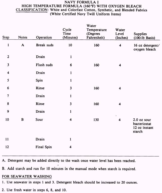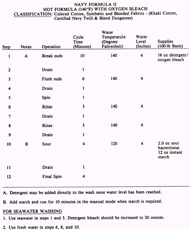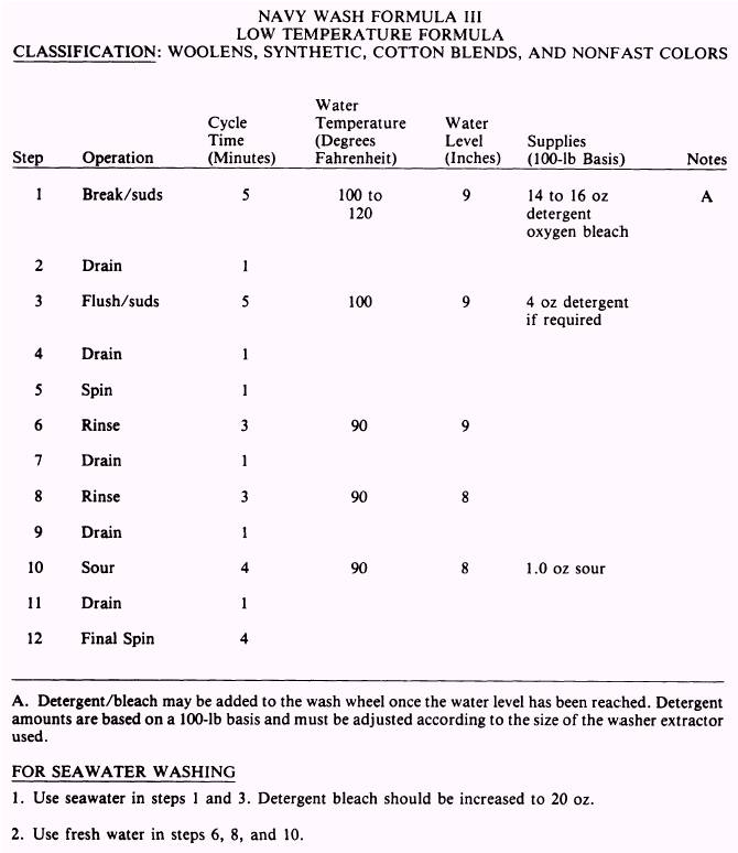 You should not be alarmed by this smell because the smell will not be transferred to the clothing. WASHING FORMULAS The Navy recently changed all Navy wash formulas to include the two-shot detergent. The new wash formulas were developed by the Navy to help shipboard personnel produce whiter and brighter washes. The formulas are illustrated in figures 5-10 through 5-12. These formulas have been tested in laundries aboard ship and have been found satisfactory for the type of work indicated. These formulas were developed to conserve energy and to meet environmental regulations while providing quality laundry. These formulas should be posted on the wash deck for laundry personnel to read and follow. RINSING Rinsing removes soil and cleaning solutions from the clothes. Poor rinsing results in grayness, disagreeable odors, harsh finish, and generally poor quality work. The number of rinses used should always be according to the Navy wash formula you are using and should not be modified. Under normal conditions, following the Navy wash formula in regards to the number of rinses, the rinse water levels, water temperature, and time of running will bring desirable results. If clothes that are heavily soiled do not come out clean in the first wash they should be washed again according to the Navy wash formula. LAUNDRY SOUR Laundry sour is added to the last rinse to neutralize the remaining alkalies and to dissolve