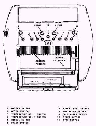 have three settings for each switch: 4. Signal switch (No. 5)- This switch is used to cancel and signal what has been called for on the program chart and allow the Milnor motor to resume operation. 5. Drain (No. 6)- The drain has three positions: OPEN, SHUT, or FORMULA. In the FORMULA position the drain opens or closes according to the formula. 6. Water level switch (No. 7)- This switch has three positions: HIGH, LOW, or AUTO. The HIGH and LOW positions are used in manual mode while the AUTO position admits water according to the program chart.