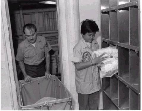 laundry, would indicate that the loss problem may be occurring in the living compartment rather than the laundry. HANDLING FINISHED LAUNDRY Handle finished laundry with care. Collect it promptly and place it in the proper bin. Do not allow unfolded clothes from the net bags to pile up around the laundry on the worktables or shelves. Be careful not to allow clothing to fall to the deck. When finished work is soiled or wrinkled by rough or careless handling, reworking is the usual result. No articles should be returned to the owner unless it represents the best quality of work and care your laundry can give it. Streaks, stains, broken buttons, or any blemishes on finished