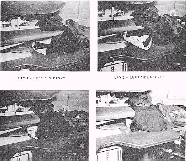 by using a hand iron. All pressers do not follow the same pattern for pressing the same article. Generally there is not much variation in different lays. Sequences of lays for trousers tops and legs, jumpers, and uniform coats are described in the following pages. The ones given are considered the minimum for each article when high-quality pressing is desired. Trouser Tops Figure 6-5 gives the sequence of lays for pressing trouser tops. With the fly open (lay No. 1), draw the left trouser top over the small end of the buck, having the fly front almost even with the front edge of the buck. Steam by using the head and applying light pressure, then dry thoroughly with the vacuum. Again place the left trouser top on the small end of the buck as shown in lay No. 2. The pocket should be in the center of the buck. Straighten the pocket and make certain that the outer edge is even and drawn together. Steam, press, and dry the lay. In lay No. 3, the left side pocket is even with the front edge of the machine and the back center seam is even with the rear edge of the buck. The left hip pocket lies in the center of the buck. Steam the material lightly and pull the pocket together. In making lay No. 4, draw the trouser top over the small end of the buck so that the end of the buck fits well down into the seat of the trousers and the back seam is directly in the center of the buck. Apply steam and light pressure and vacuum dry. In making lay Nos. 5, 6, and 7, continue on around the trouser top, pressing the right side. These lays are not shown as they correspond closely to lays 3, 2, and 1.