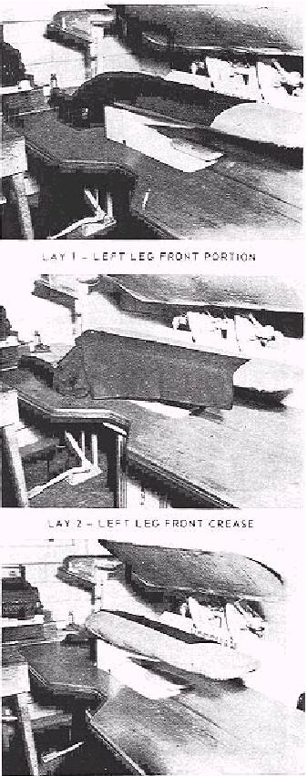 Figure 6-5.-Lays for pressing trouser tops. When available, the automatic topper press may be used to press trouser tops. The topper press eliminates the need for lays discussed above and also speeds up production. This type of press is discussed later. Trouser Legs Lays for pressing trouser legs are given in figure 6-6. The first step is to place the front portion of the left leg on the buck- crotch at the large end, the inside of the leg facing upward, the seams lying on the center of the buck (see lay No. 1). Make sure that one seam rests upon the other for the entire length of the leg. Apply steam to soften the material and straighten the knee. Lay the left leg, as shown in lay No. 2, on the front of the buck so that the front crease is in the center of the buck and the top of the trouser is at the large end of the buck in a line with the second or third button of the fly (or, if zippered, 2 or 3 inches from the bottom) in position so the crease will extend upward as far as possible. In lay No. 3, move the trouser leg to the rear of the buck so that the back crease is lying on the center of the buck. The leg should be placed so that at least 4 inches of the seat will be creased. Extend the crease as high as possible without wrinkling the crotch. Lay Nos. 4 (right leg, front portion), 5 (right leg front crease), and 6 (right leg rear crease) are substantially the same as lays 1, 2, and 3 of figure 6-6. Uniform Coats Check figure 6-7 (lays 1 through 6) and figure 6-8 (lays 7, 11, and 13) for the lays used in pressing uniforms coats. Place the left side of the coat collar and the left lapel on the rear of the large end of the buck and press as shown in lay No. 1. This operation shrinks the collar at the gorge seam, restoring the shape of the garment where it tends to stretch, from the seam at the shoulder down to about 5 inches below the gorge seam. Lay No. 2 is similar to lay No. 1 except that the right side of the collar and the right lapel are pressed. Make this lay on the front of the large end of the buck. Lay Nos. 1 and 2 serve to restore the balance of the coat so that the left front and right front hang evenly. After creasing the two sides of the collar, place the collar on the large end of the buch (see lay No. 3) so that the center is on the center line of the buck. In most cases the collar is stretched while