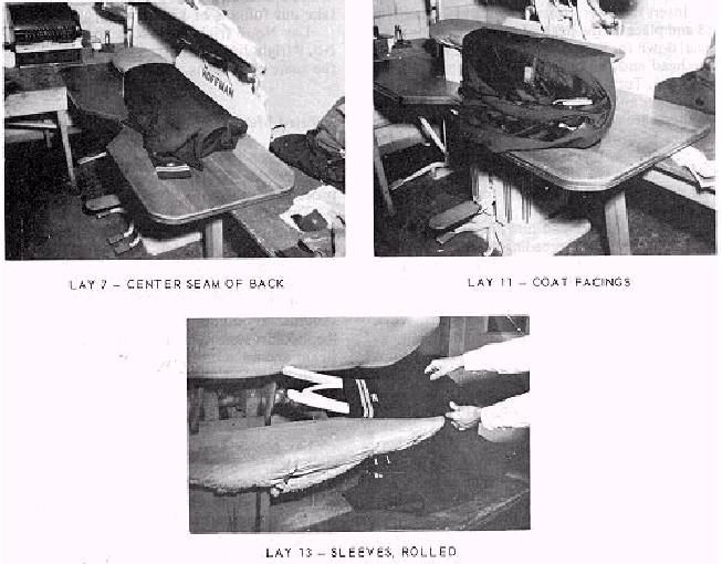 Figure 6-8.-Lays 7, 11, and 13 for pressing uniform coats. being worn. Distribute the extra fullness over the length of the collar and steam freely. In lay No. 4, place the right front of the coat at an angle to bring out the chest. Never stretch the front of the coat; gather in the front slightly and shrink it to the proper length. Steam well before applying pressure, then vacuum dry. See that the pocket is smooth. Move the coat forward on the buck for lay No. 5. The small end of the buck fits into the chest about 1 inch below the armhole pit and within 2 or 3 inches of the side seam. Any fullness on the dart seam should be taken in between the pocket and the armhole pit. In lay No. 6, place the right half of the back on the buck so that the lay is about 1 inch from the right armhole and about 2 inches below the collar. The side seam slants in from the armhole;