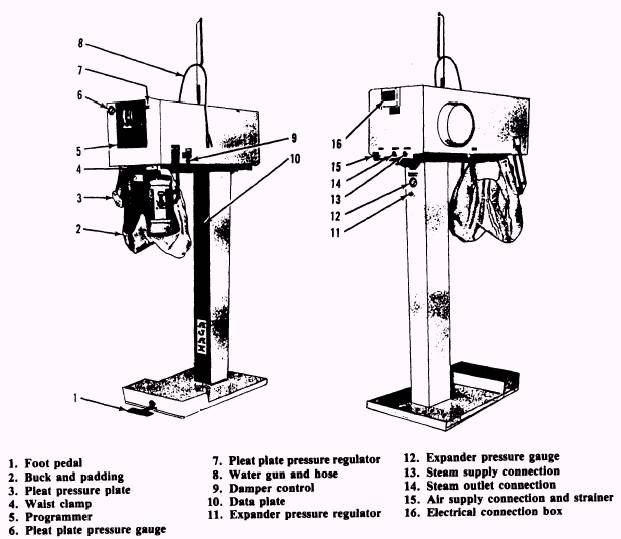 Figure 6-14.-- Automatic pants topper. production of trouser tops. The automatic pants topper is quicker and eliminates the several lays required to finish trouser tops on a conventional press by using air and steam. Steam and air are set automatically and then released into the air bag for a desired period of time in which the trouser tops are finished. The pants topper can be run manually or automatically. Refer to your technical manual for correct operating procedures. ASSEMBLING AND ISSUING When you finish pressing the clothes, you get them ready for issuing. Use the dry-cleaning lists for assembling articles into customer groups. The number on each master tag attached to the dry-cleaning list corresponds to the numbers of various articles in a customer's bundle. Put the tags in numerical order and collect all articles belonging to each master tag. Be sure that all articles written on the customer's dry-cleaning list are present and accounted for. Then check to see that all buttons are intact and that belts and buckles are present. Missing buttons should be replaced, and all belts and buckles presented to the laundry should be returned with the cleaned article or replaced when lost. After you collect and check all items that