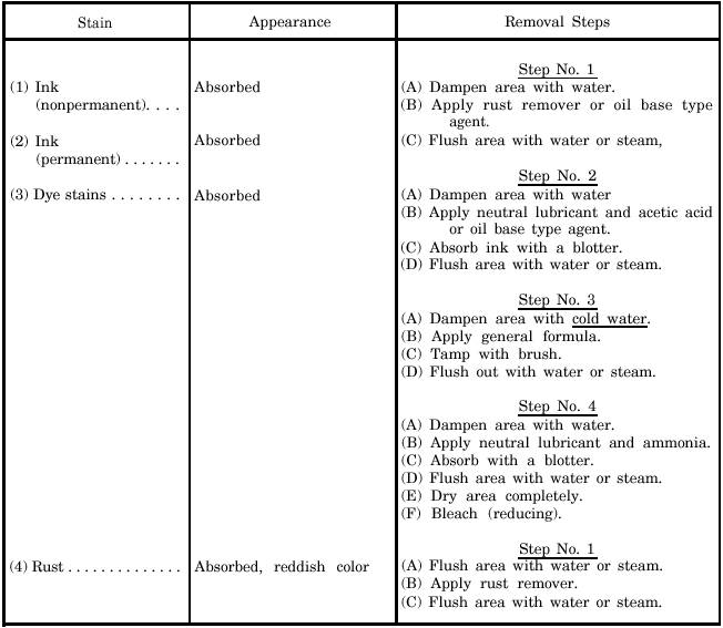 Table 6-4.- Spot and Stain Removal Chart- Continued Stain Appearance Removal Steps Step No. 1 (1) Ink Absorbed (A) Dampen area with water. (nonpermanent). . . . (B) Apply rust remover or oil base type agent. (2) Ink Absorbed (C) Flush area with water or steam, (permanent) . . . . . . . Step No. 2 (3) Dye stains . . . . . . . . Absorbed (A) Dampen area with water (B) Apply neutral lubricant and acetic acid or oil base type agent. (C) Absorb ink with a blotter. (D) Flush area with water or steam. Step No. 3 (A) Dampen area with cold water. (B) Apply general formula. (C) Tamp with brush. (D) Flush out with water or steam. Step No. 4 (A) Dampen area with water. (B) Apply neutral lubricant and ammonia. (C) Absorb with a blotter. (D) Flush area with water or steam. (E) Dry area completely. (F) Bleach (reducing). Step No. 1 (4) Rust . . . . . . . . . . . . . . Absorbed, reddish color (A) Flush area with water or steam. (B) Apply rust remover. (C) Flush area with water or steam.