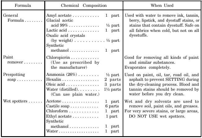 Table 6-5.- Spotting Formulas Formula Chemical Composition When Used General Amyl acetate . . . . . . . . . . . 1 part Used with water to remove ink, tannin, Formula . . . . . . . . Glacial acetic berry, lipstick, and dyestuff stains, or acid 99% . . . . . . . . . . . . . 1/2 part stains that contain dyestuff. Safe on Lactic acid . . . . . . . . . . . . . 1 part all fabrics when cold, but not on all Oxalic acid crystals dyestuffs. (by weight) . . . . . . . . . . . 1/2 part Synthetic methanol . . . . . . . . . . . . . 1 part Paint Chloropicrin . . . . . . . . . . . . Good for removing all kinds of paint remover . . . . . . . . (Use as prescribed by and similar substances. the manufacturer) Evaporates completely. Prespotting Ammonia (26%) . . . . . . . . 1/2 part Used on paint, oil, tar, road oil, and soap . . . . . . . . . . . Hexalin . . . . . . . . . . . . . . . . 2 parts asphalt to prevent SETTING during Oleic acid . . . . . . . . . . . . . . 3 parts the dry-cleaning process. Blood and Water (distilled). . . . . . . . . 11/2 parts tannin stains should be removed by (Can use plain water.) water before you dry clean. Wet spotters . . . . . . Acetone . . . . . . . . . . . . . . . . 1 part Wet and dry solvents are used to Castile soap . . . . . . . . . . . . 6 parts remove soil, paint oils, and greases. Chloroform . . . . . . . . . . . . 1 part For very severe stains, or large areas, Ethyl acetate . . . . . . . . . . . 1 part DO NOT USE wet spotters. Synthetic methanol . . . . . . . . . . . . . 1 part Water . . . . . . . . . . . . . . . . . . 1 part |