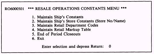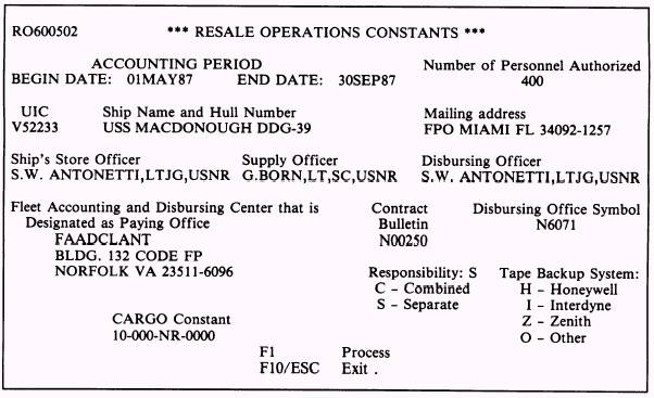 Figure 2-17.-Resale operations constants menu. 2-27 . Number of personnel authorized-This is the number of personnel authorized for manning aboard ship. This number is used for calculating and printing the inventory control record. ROM users will enter a positive number from 1 to 9999. Commas and decimal points are not allowed. . Ship's UIC-Enter the ship's UIC. It should be proceeded by the service designator, normally R or V. . Ship's name and hull number-Enter the ship's name and hull number. . Mailing address-Enter the ship's mailing address. . Ship's store officer-Enter the ship's store officer's name and rank. . Supply officer-Enter the supply officer's name and rank. . Disbursing officer-Enter the disbursing officer's name and rank. . Fleet accounting and disbursing center- Enter the address of the designated paying office on all purchase orders for which fast pay procedures apply. This address will be included on four lines with a maximum of 30 alphanumeric characters. . Contract bulletin number-Enter the contract bulletin number. . Responsibility-Enter the type of responsibility your ship's store operation is operating under by entering C for combined responsibility and S for separate responsibility. . Tape backup system-Enter H for Honeywell, I for Interyne, Z for Zenith, or O for Other. . CARGO constant-Enter the CARGO constant. Do not exceed 14 alphanumeric characters. After you complete all the above entries, you depress function key F1 and, if the accounting period dates are changed, the resale operations constants screen shown in figure 2-19 will be displayed, and you will verify that the beginning and ending dates for the accounting period are