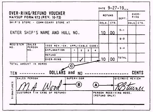 OVERRINGS AND UNDERRINGS On occasion, the operator of the ship's store will make an error in ringing up the price of an item on the register. The operator may ring up less than the selling price. In this case, he or she would ring up the difference between the correct price and the amount rung up in error. This type of error is called an underring and you should always advise the customer of the error. On the other hand, if the cash register operator rings up a price higher than the selling price, he or she will prepare an Overring/Refund Voucher, NAVSUP Form 972 (fig. 3-2), to cover the difference. You, as the collection agent, should verify the overring voucher and make sure the ship's store officer approves it. Refer to the letters A through C in figure 3-2. The ship's store officer's signature should appear in block A in the figure. The ship's store operator should also sign the voucher in block B. The total amount in figures must agree with the total amount in words in block C. Unlike the refund voucher, the overring voucher does not require the signature of the customer and, therefore, verification of legality is very important. The NAVSUP Form 972 will be stapled to the applicable page of the Cash Register Record, NAVSUP Form 469. RETURNED PERSONAL CHECKS When a check is returned due to insufficient funds, the ship's store officer will reimburse the disbursing officer from cash received from sales. The dishonored check is placed in the register and remains there until a settlement for the check is made. The amount of the check is carried as retail store inventory during this time. Once a settlement is made, the funds are placed in the register and the check is returned to the person who wrote it. If the check is not settled by the end of the accounting period or when the ship's store officer or sales outlet operator is relieved, the store operator will make sure the check is listed on inventory prelisting and the amount of the check included in the inventory. ROM users must accomplish a few tasks to make sure the check is included in the inventory. First, a new retail department code must be established. The code X9 titled Uncollectible Checks will be used. The addition of department codes can be accomplished on the ROM through the ship's store constant