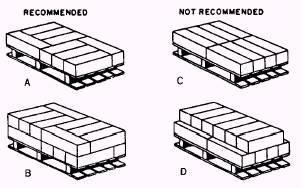 Figure 4-3.-Box pallet. When loading a pallet, three things must be considered: (1) maximum load, (2) stability, and (3) proper pallet size. Make sure the pallet will pass through all doors, aisles, and hatches likely to be encountered. The stability of the material on the pallet must be considered and a decision made as to the type of pallet to use, platform or box pallet. Figure 4-4 shows the recommended and not recommended ways to load material on a pallet. Since the size of the boxes being loaded will determine their arrangement on the pallet, a standard loading pattern is not always appropriate. However, in the illustration you can see that the material not only fits the pallet (in recommended A and B stacking), but they are arranged to provide stability against slipping and sliding. Boxes of materials are not always the same
