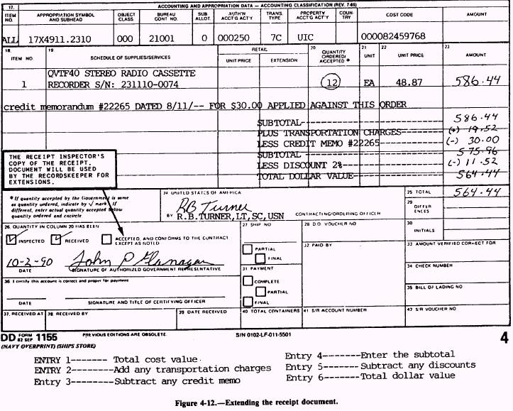 EXTENDING RECEIPTS You first need to determine the total dollar value of each receipt document so it can be entered to the Journal of Receipts, NAVSUP Form 977, located in the Journal of Receipts and Journal of Expenditures File, SSA-3. This is done by manually extending the receipt document and entering the available receipt data into the ROM system. Once the receipt document is received by the ship's store office, the ship's store officer will compare the quantities received on the receipt inspectors and incoming material file copy to make sure quantities agree. The ship's store officer will forward the receipt inspector's copy to the recordskeeper for extensions and manually extend the incoming material file copy. Once you receive the receipt inspector's copy of the receipt document, you should pull the identical copies of the receipt document from the Outstanding Purchase Order File (SSA-11A). You will then enter all receipt data available in the ROM receipt function using the instructions contained in the ROM system Terminal Users Guide (TUG). ROM will assign a receiving number to each receipt entered and extend the receipt document at cost price. ROM will compute the total dollar value at cost price for each receipt based on the information you enter and post this amount to the Journal of Receipts, NAVSUP Form 977. The quantity received is also posted to the Stock Record, NAVSUP Form 464. After you enter all appropriate receipt information into the ROM system, you will determine the total cost value of the receipt document manually. First, multiply the cost price of each item on the receipt document by the quantity received to get the cost value for each item. Add each of these cost values together to get your total cost value for the receipt document. Use the following formula to determine the total dollar value of the receipt document: total cost value plus transportation charges less credit memos less discounts equals the total dollar value. Study each step in figure 4-12 as we extend this example receipt document manually. The first step is to figure the total cost value for this receipt document. We do this by multiplying the quantity received, 12, by the cost price, $48.87, which will give us a total cost value of $586.44 for this receipt document. This receipt document has only one item; if there were more than one item, we would have to add extensions for each item together to get the total cost value. Next, we will add transportation charges, if any, to this total cost value. In our example, transportation charges are $19,52, which we will add to the total cost value of $586.44 and get $605.96. The next entry will be the amount of the credit memo, if any. The credit memo will be subtracted from the total cost value and any transportation charges. In our example, the total cost value, $586.44, plus transportation charges, $19.52, less credit memo, $30.00, equals a subtotal of $575.96. The subtotal of $575.96 is the figure