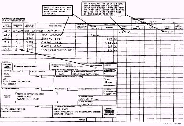 4-17 Figure 4-12. we will use to determine our discount, if any. In our example, we have a discount of 2 percent. To figure the discount amount, we simply multiply the subtotal, $575.96, by 2 percent and come up with the discount total of $11.52. This $11.52 is subtracted from the subtotal of $575.96 to give us a total dollar value of $564.44 that we should post to the ship's store records. Once you complete your extensions on the receipt document, forward your copy to the ship's store officer who will make sure his or her extensions match with yours. Any differences will be examined and resolved; then your copy will be returned. Once the totals agree, you will enter the amount on all copies of the receipt document. You will compare the manually extended dollar amount on the receipt document with the amount posted by the ROM system to the Journal of Receipts, NAVSUP Form 977, to make sure they agree. If they don't agree, you will have to determine the problem and correct any errors. JOURNAL OF RECEIPTS As mentioned earlier in chapter 2, the Journal of Receipts, NAVSUP Form 977, is located in file SSA-3 and is used to provide a record of all receipts at cost price. Once you extend the receipt document and determine the total dollar value at cost, you will enter the figure to the appropriate column of the NAVSUP Form 977 as discussed earlier in chapter 2. In figure 4-13, we provide an example of this process by posting the receipt document shown in figure 4-12. First we enter the date, the receiving number, and the serial number on the journal of receipts. The receiving number assigned to this receipt is 5 so we will enter 5 on all copies of the receipt document as shown in the illustration. Then we will enter the source of the receipt and the amount in the appropriate column of the NAVSUP Form 977. Since it is a receipt from purchase, we will post it to the Purchase column on the journal of receipts under the heading Ship's Store. The ROM system automatically maintains the NAVSUP Form 977. The