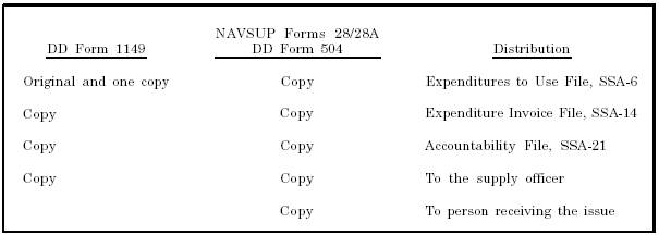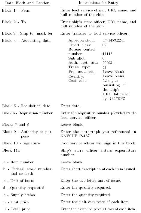 and returns the original and two copies to the ship's store officer. In manual recordskeeping, the total quantities issued will be expended from the Stock Record, NAVSUP Form 464, and the total dollar value of the DD Form 1149 is entered on the Journal of Expenditures, NAVSUP Form 978. In combined responsibility operations, the total dollar value will be expended on the Ship's Store Afloat Financial Control Record, NAVSUP Form 235. ROM users will enter issues to the Marine Corps in the ROM miscellaneous expenditure activity function as an issue to ship's use. The ROM system will post issue data to the NAVSUP Forms 464 and 978. For combined responsibility operations, the ROM will expend the total dollar value on the NAVSUP Form 235. The signed original of the DD Form 1149 and one copy are filed in the Expenditures to Use File, SSA-6, and later submitted with the returns. One copy is also filed in the Accountability File, SSA-21, and later filed in the retained returns. ISSUES TO SURVIVORS OF MARINE AND AIRCRAFT DISASTERS Ship's store items may be sold for cash to survivors of marine and aircraft disasters if they have personal funds in their possession. If the survivor is without personal funds in his or her possession, upon written orders of the commanding officer, items required for health and comfort may be issued or donated by personnel of the rescuing ship. The sale or donation of clothing items to survivors who are nonnaval personnel is restricted to nondistinctive items. All issues or donations are receipted for by each survivor on a Requisition Receipt, NAVSUP Forms 28/28A, and are accounted for in the same manner as issues to Marine Corps personnel. ISSUES TO MERCHANT SHIPS IN DISTRESS When authorized by the senior officer present, and on written orders from the commanding officer, merchant ships in distress may be issued items of ship's store stock including nondistinctive clothing. Each order must include the important circumstances surrounding the issue and, when possible, cash must be collected at the time of issue. When it is impossible to sell them for cash, the items issued will be invoiced to the Navy Ships Parts Control Center, Mechanicsburg, PA. ROM users will enter issues to merchant ships in distress as an Other Supply Officer (OSO) transfer in the ROM miscellaneous expenditure activity function. The ROM will assign an expenditure number and post the issue data to the NAVSUP Forms 464 and 978 and to the NAVCOMPT Form 153. ISSUES FOR BURIAL OF THE DEAD Articles of clothing for burial of the dead will be issued when requested by the commanding officer or medical officer. Issues such as this are expended from the Navy Stock Fund charging the appropriation, Operations and Maintenance, Navy, and the appropriate BUMED subhead. ISSUES TO THE GENERAL MESS Beverages and individual-sized servings of food items, when needed for special meals, are issued to the general mess. Issues such as this to the general mess are expended at cost price on a DD Form 1149. Figure 5-1 illustrates the DD Form 1149 properly prepared for an issue to the general mess. Follow along as we discuss the entries below: