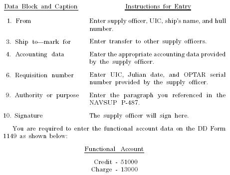 Figure 5-2.-Issues to ship's use. Also, the following statement must be included on ALL DD Forms 1149 covering issues to ship's use: "This issue meets the criteria of SECNAVINST 3590.4 and is to be used specifically for (fill in as appropriate)." The ship's store officer will approve the issue, assign a ship's store expenditure number, and receiving persons will sign and date the DD Form 1149 when they receive the items issued. DISTRIBUTING ISSUES TO SHIP'S USE The DD Form 1149 is distributed as follows: l Original and one copy to the Expenditures to Use File, SSA-6, and later submitted with the returns . One copy to the Accountability File, SSA-21, and later to the retained returns . One copy to the Expenditure Invoice File, SSA-14 l One copy to the supply officer for posting to the ship's requisition/OPTAR log or other appropriate record This information is now available on CD in Adobe PDF Printable Format |