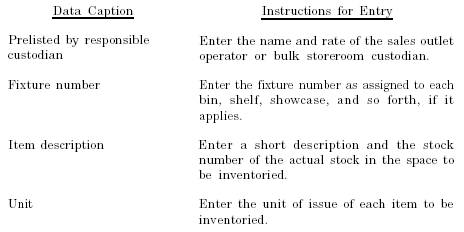 INVENTORY PROCEDURES The ship's store officer, as we mentioned earlier, is responsible for the inventory. In manual recordskeeping, the Inventory Count Sheet, NAVSUP Form 238, is used to record inventories. Each set of count sheets consists of four copies that are color-coded in white, yellow, pink, and blue. Count sheets are serialized by the ship's store officer using a locally prepared number control log for inventory count sheets. The number control log also includes columns for the serial number, first count team, second count team, and count sheet returned to the ship's store officer. The same serial number is used for the entire set of four sheets. The serial numbers must be accounted for whether used or voided. After all count sheets are serialized, the ship's store officer will provide sufficient sets to each sales outlet operator and bulk storeroom custodian. A separate set of inventory count sheets is used for each space inventoried. Before inventory, the custodian of the space being inventoried must prelist the required information on the Inventory Count Sheet, NAVSUP Form 238. The actual stock to be inventoried is recorded on the inventory count sheet following the inventory pattern. The inventory pattern is determined before the actual inventory count. Normally the inventory pattern of a space begins on the left and works to the right of each section of the space and the responsible custodian follows this pattern when prelisting information. The responsible custodian is required to prelist the following information on the NAVSUP Form 238: