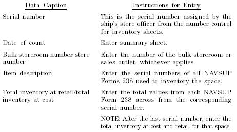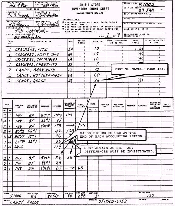 CREDIT INVOICES At the end of the accounting period, the following will be carried as part of the inventory: 1) the dollar value of credit memorandums that have not been posted to the Journal of Receipts, NAVSUP Form 977, and transmitted to FAADC; and 2) the dollar value of a cash refund for which a refund check has not been received. The expenditure number of the Requisition and Invoice/Shipping Document, DD Form 1149, and the date and value of material returned must be listed on the last page of the inventory for the bulk storeroom. In ROM procedures, the ROM system automatically posts credit memorandums or cash refunds from the miscellaneous expenditure file that have not been liquidated. DISTRIBUTION OF THE INVENTORY COUNT SHEETS IN MANUAL RECORDS In manual records, after the inventory, the inventory count sheets are distributed as listed in the following paragraphs. The white copy goes to the ship's store officer for extensions. This copy will ultimately be filed in the Accountability File, SSA-21, until the end of the next accounting period and then filed in the retained returns. The yellow copy goes to the recordskeeper for extensions and used as a working copy. Later it is filed in the retained returns. The pink copy goes to the responsible custodian. The blue copy is used as a price list (optional). When inventory is taken for the purpose of relieving the ship's store officer, one copy of the inventory is also given to the detaching ship's store officer. DISTRIBUTION OF THE INVENTORY COUNT SHEETS IN ROM PROCEDURES In ROM procedures, after inventory, the rough inventory count sheets and smooth inventory listing are distributed according to the following paragraphs: . The original of the rough inventory count sheet and smooth inventory listing are filed in the Accountability File, SSA-21. . The first copy of the rough inventory count sheet and the smooth inventory listing are used by the ship's store recordskeeper as a working copy and later filed in the retained returns. . The third copy of the rough inventory count sheet and smooth inventory listing are given to the responsible custodian. . The fourth copy of the rough inventory count sheet may be discarded and the smooth inventory listing may be used as a price list. INVENTORY EXTENSIONS IN MANUAL RECORDSKEEPING In manual recordskeeping, the retail and cost prices are entered on the NAVSUP Form 238 and